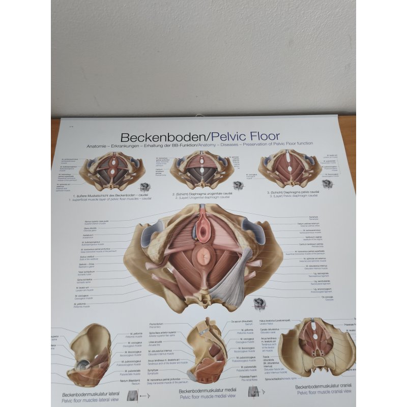 Toto schéma pánve zobrazuje anatomii pánve a dna pánevního. Všechny orgány, svaly i vazy jsou odborně popsány. Popisky na této schémě jsou uvedeny v angličtině a němčině. Sleva z důvodu pomačkaní levé hrany. Skladem 1 ks.